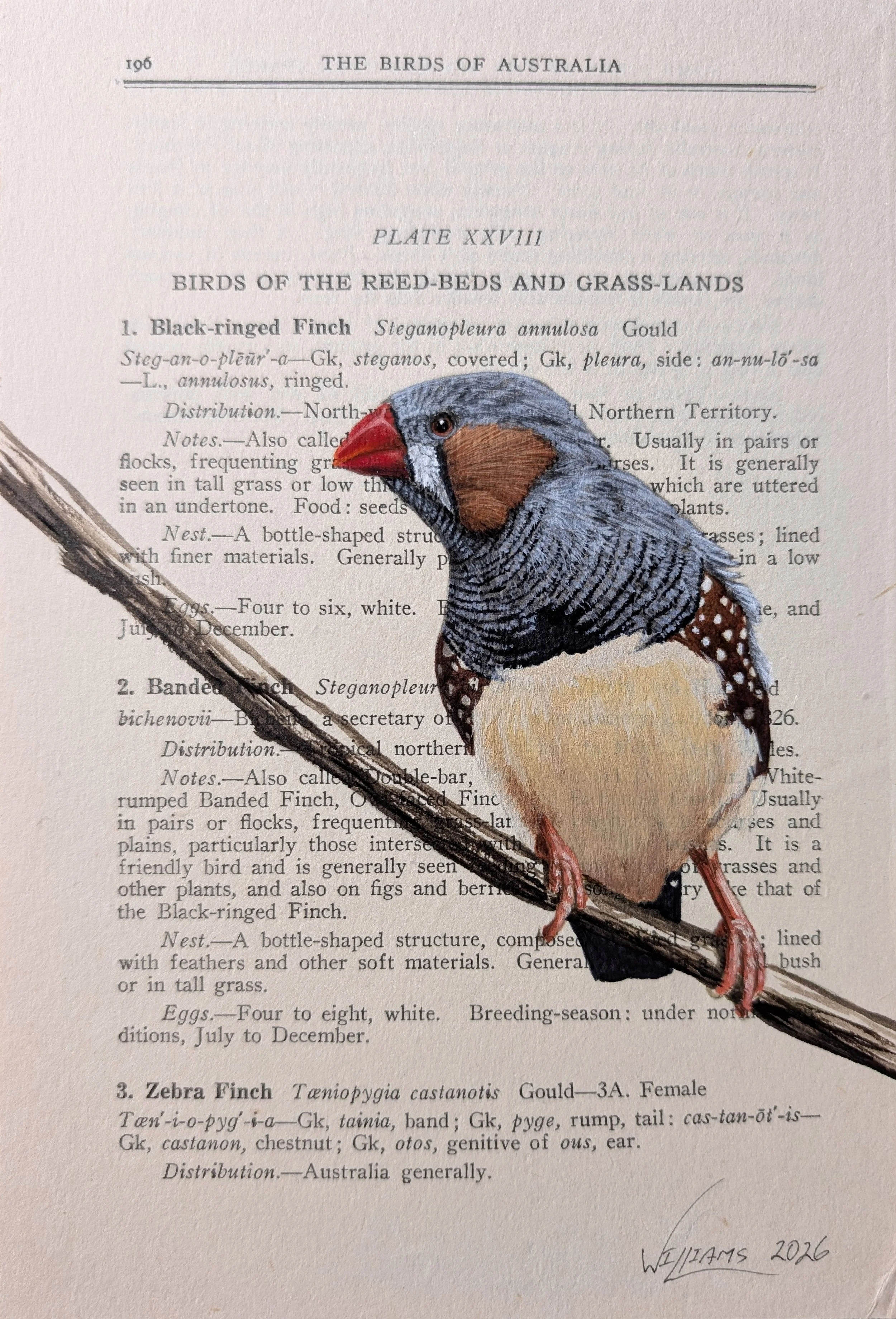 Zebra Finch on vintage (1948) page from ‘What Bird is That?’ by Neville W. Cayley