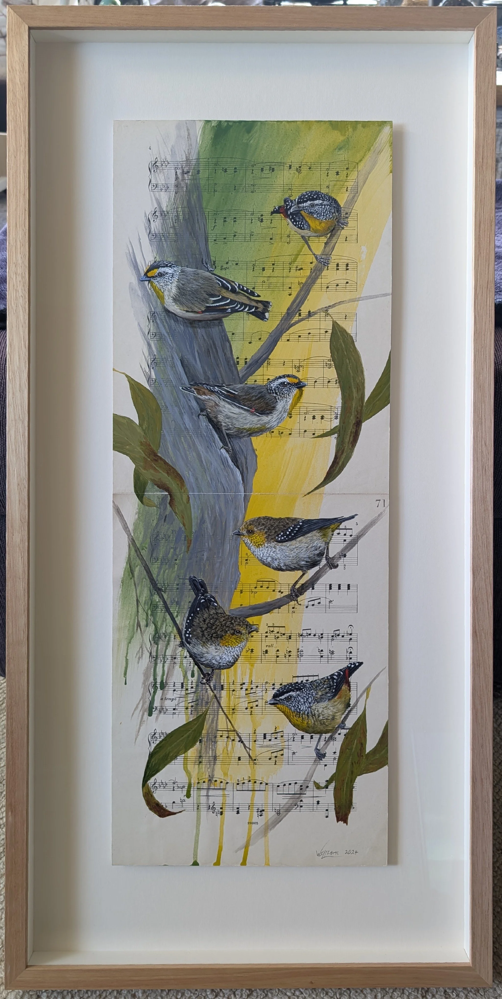 Tasmanian Pardalotes on vintage (1919) pages from a book of collected music
